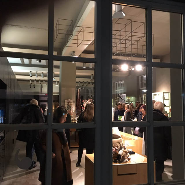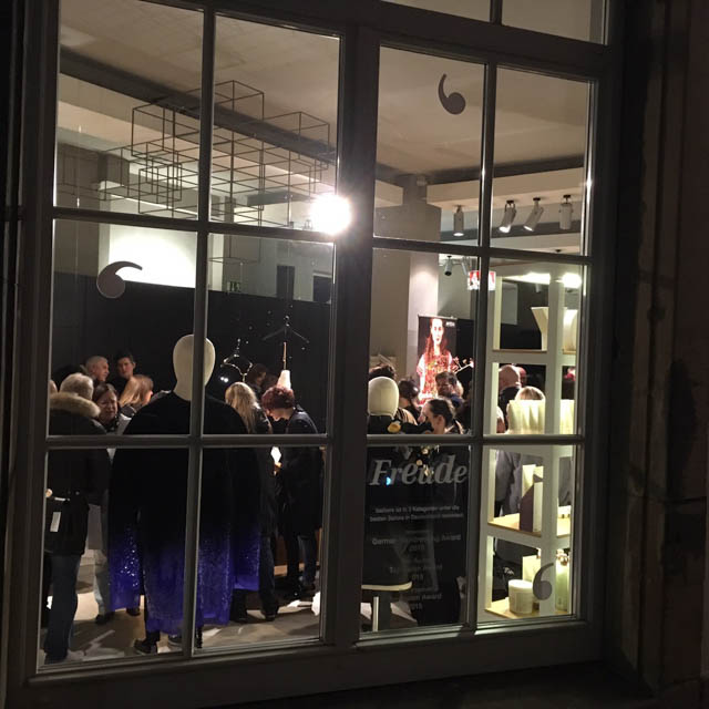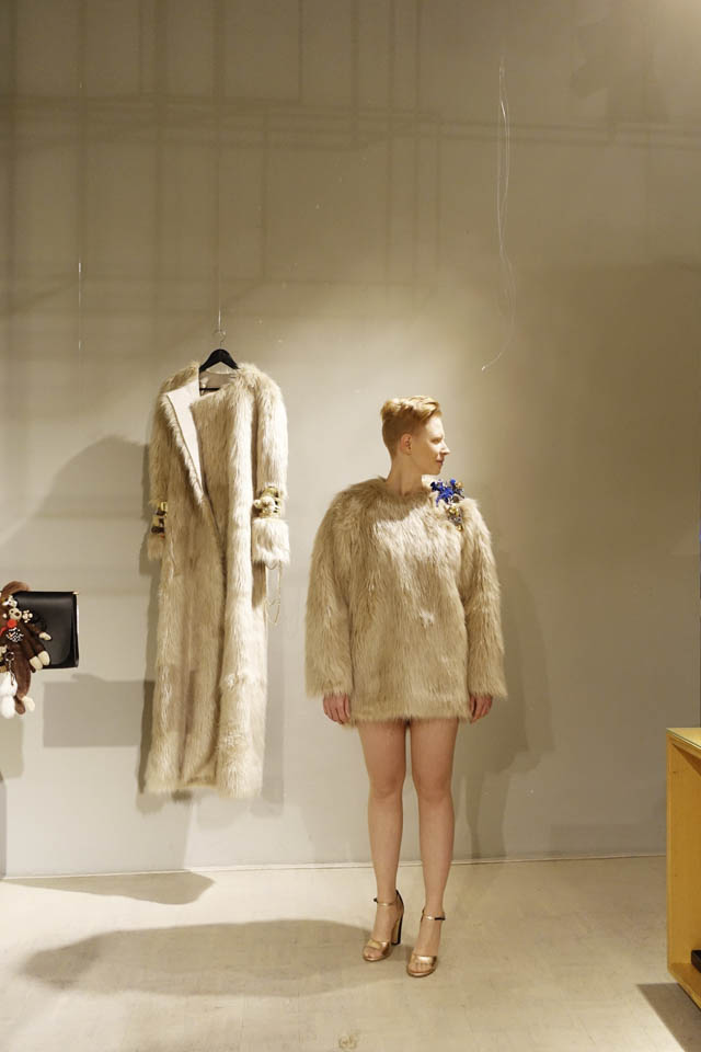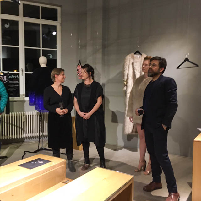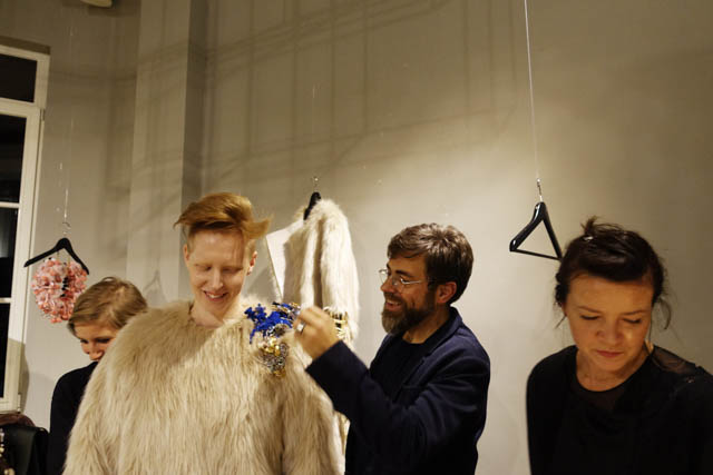 barbers Salon Manager Andreas W. Klug schneidet den von Claudia Throm entworfenen (Kunst-) Fellpullover im Schulterbereich mit Kamm und Schere, auf dem eine samtüberwuchernde Brosche von Bastard Collection ihren Platz findet. Die Verbindungen von  Schmuck, Haare und Mode wurden mit dieser spontanen Performance auf der sehr gut besuchten Vernissage in den Fokus gerückt.