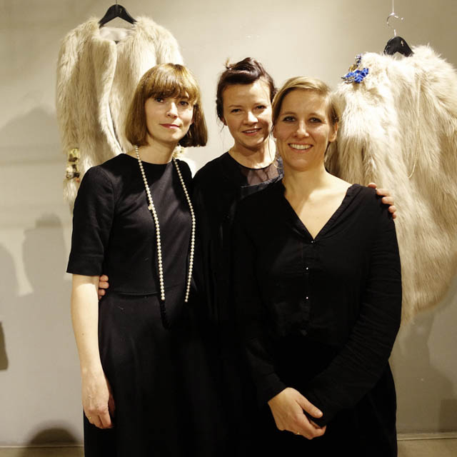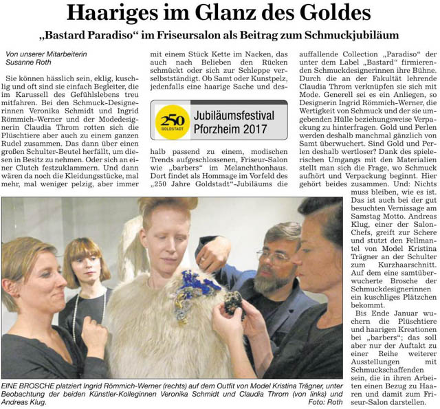 barbers Salon manager Andreas W. Klug cuts Claudia Throm’s fur coat in the shoulder area with comb and scissors, on which a velvety brooch from Bastard Collection finds its place. The connections of jewelery, hair and fashion were brought to the fore with this spontaneous performance at the very well attended Vernissage.